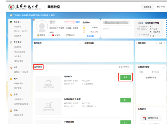 1、登錄后,進(jìn)入主頁面,找到在學(xué)課程,然后進(jìn)入學(xué)習(xí)。